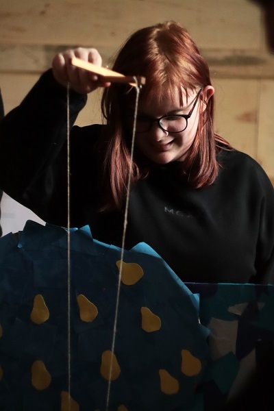 Die Klasse der Brünlasbergschule stellte selbst eine Puppenbühne und die dazugehörigen Puppen aus. Jede Schülerin und jeder Schüler hatte im Kunstunterricht bei Herrn Uhlig eine Marionette aus Astholz gebaut, im Textilunterricht bei Frau Markert und Frau Henning einen Schmetterling aus Draht und Stoffresten. Bei der Musik hat uns sogar die Klasse der Oberstufe 2, in einem gemeinsamen Projekt mit Frau Siegel, unterstützt.